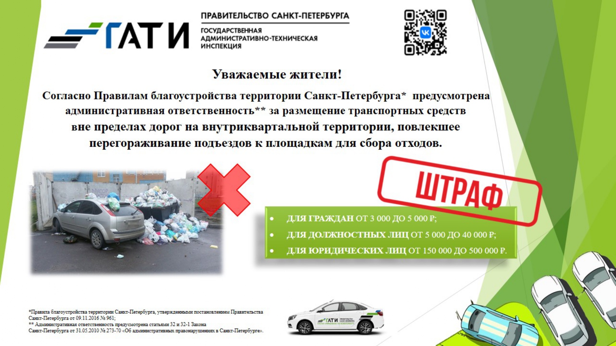 размещение транспортных средств на территориях зеленых насаждений общего пользования, зеленых насаждений, выполняющих специальные функции, зеленых насаждений ограниченного пользования, газонах, на территориях детских, спортивных площадок, площадок для выгула и дрессировки животных, вне пределов дорог на внутриквартальной территории, повлекшее перегораживание подъездов к площадкам для сбора отходов, а также размещение транспортных средств вне пределов дорог на внутриквартальной территории, повлекшее перегораживание внутриквартальных проездов, пешеходных дорожек, проходов к зданиям и входов в них.
