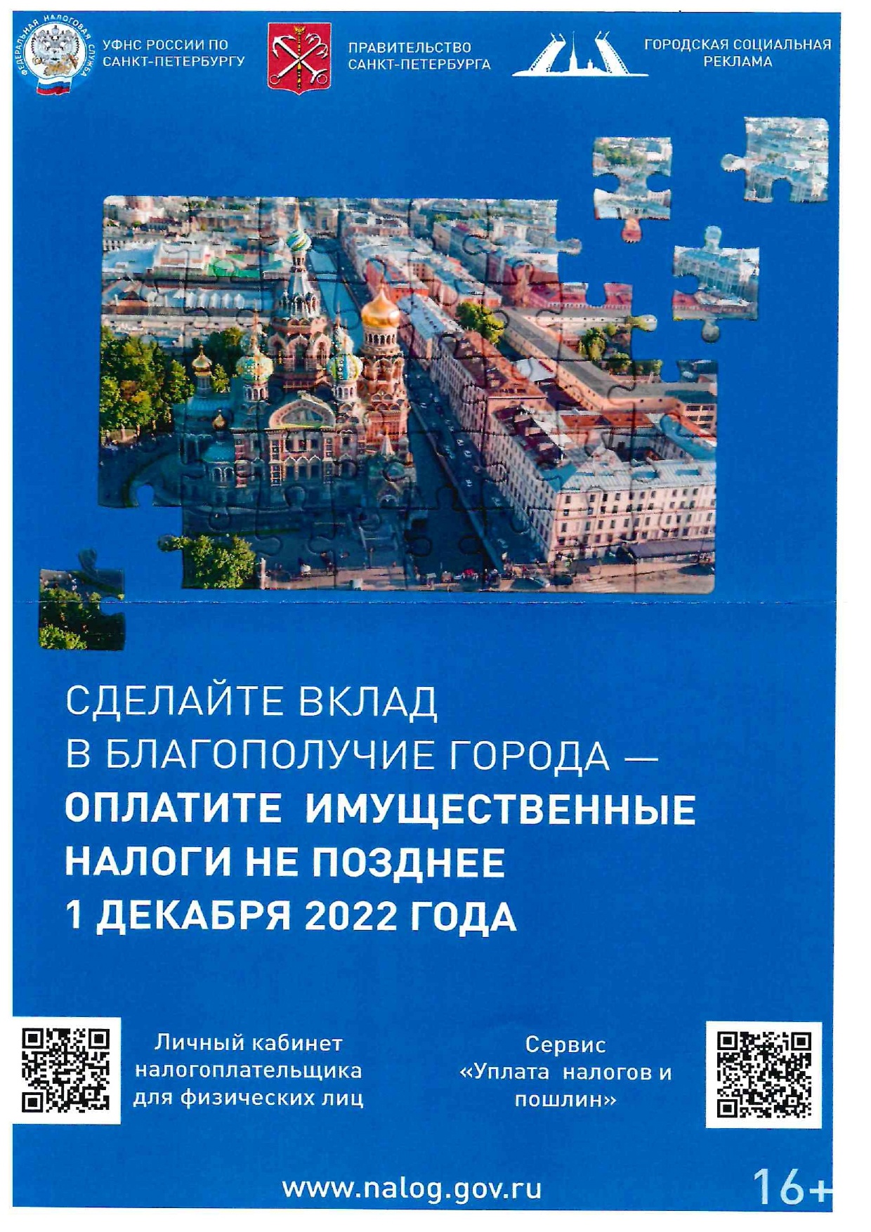 Уважаемые наши жители, межрайонная инспекция Федеральной налоговой службы России № 25 по СПб информирует о необходимости оплаты имущественных налогов не позднее 1 декабря 2022 года.