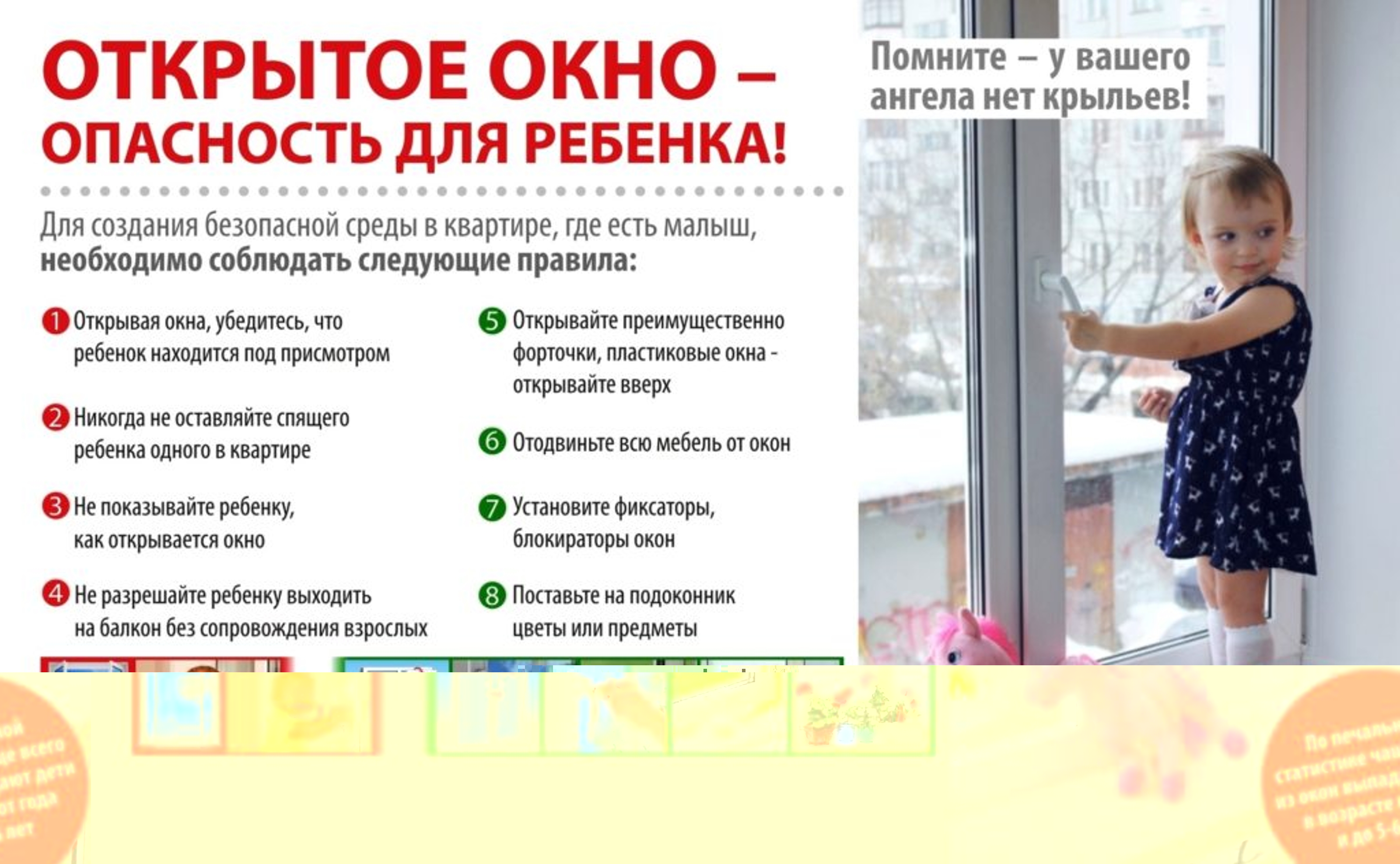- ребенок не может находиться без присмотра в помещении, где открыто настежь окно или есть хоть малейшая вероятность, что ребенок может его самостоятельно открыть;