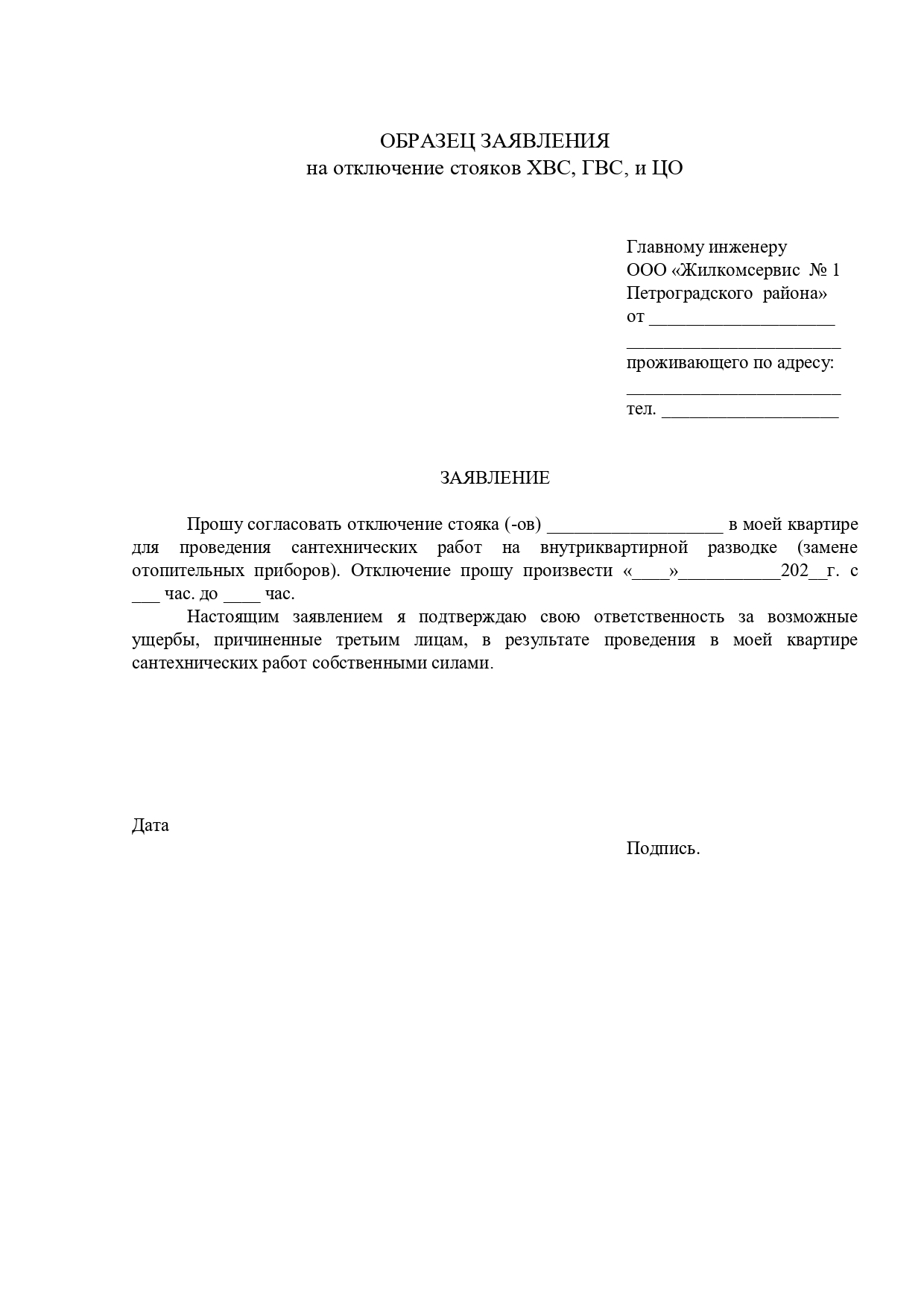 Отключение стояков ХВС, ГВС и ЦО для проведения работ по замене сантехнического оборудования и отопительных приборов в ваших квартирах производится в порядке оказания платных услуг населению, на основании письменного согласования главного инженера ООО «ЖКС № 1 Петроградского района» на личном заявление собственника (нанимателя) жилого помещения.