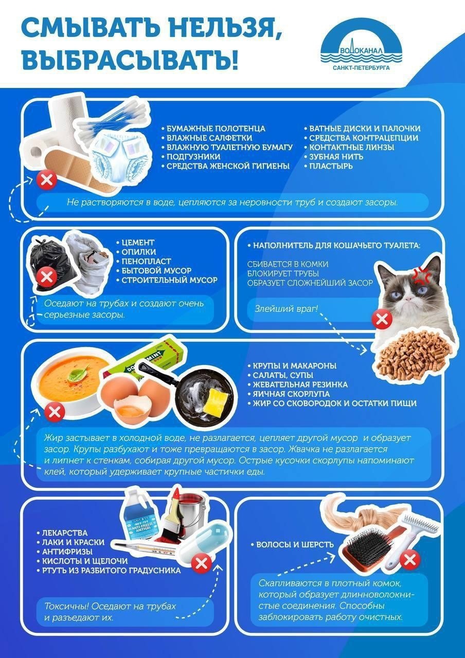Уважаемые жители, информируем Вас, что в целях исключения подтопления подвальных помещений в многоквартирных домах, недопустим сброс посторонних предметов в канализацию и веществ, которые могут привести к недопустимым негативным последствия на работоспособность систем водоотведения